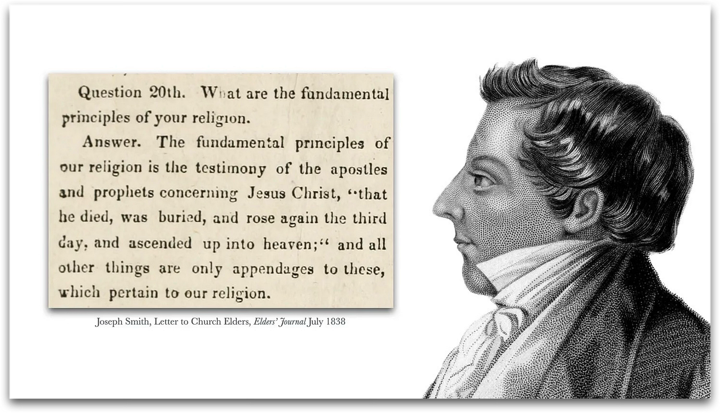 To see how that emphasis arose, we need to start at the beginning of the Mormon story. The earliest LDS scriptures and sermons resembled broader nineteenth-century Protestant crucicentrism. The 1830 Articles and Covenants (now Doctrine and Covenants 20) confess that Christ “was crucified, died, and rose again the third day.” Joseph Smith exhorted his followers to “preach Christ, and Him crucified” (cf. 1 Corinthians 2:2). In fact, he referred to Gethsemane in connection with atonement only once, as far as I can find, and that connection remains fairly weak.